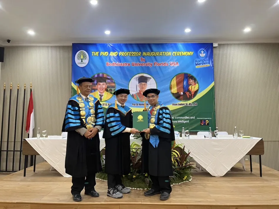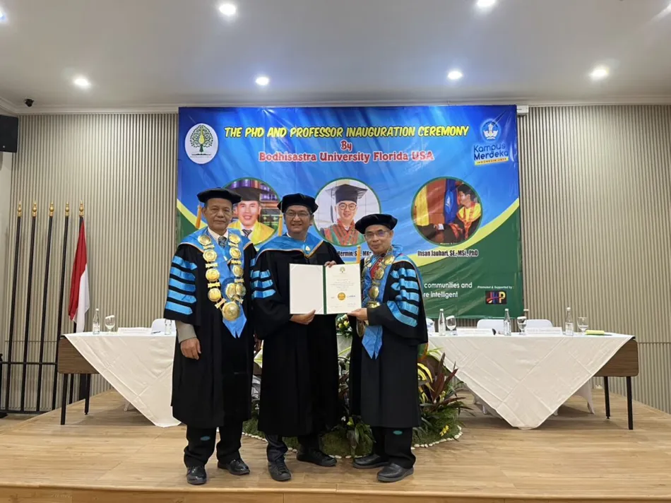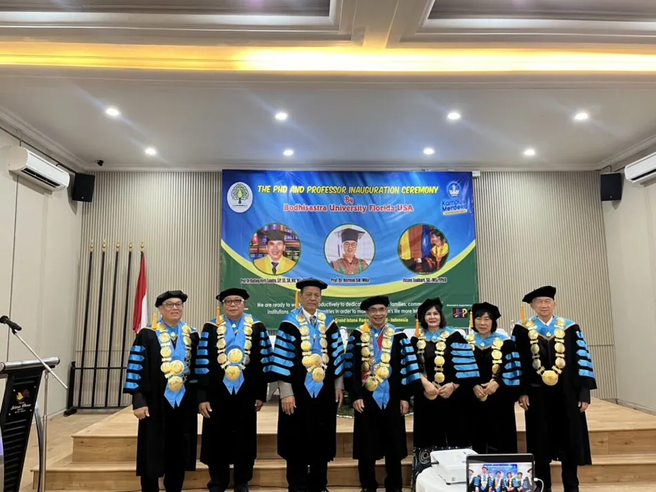 the Office of the President for Indonesia and the BOU Indonesia Alumni Association conferred Professor positions to two Indonesians: • Dr. Dadang Herli Saputra, SIP., SH., SS., MH., MSi., MKn • Dr. Hermin, SH., MKn And an Honorary Doctorate was awarded to: • Ihsan Jauhari, SE., MSi The ceremony was conducted by the Chancellor and Senior Rector and Executive team from Thailand, with the recipients and their families celebrating this joyous occasion."